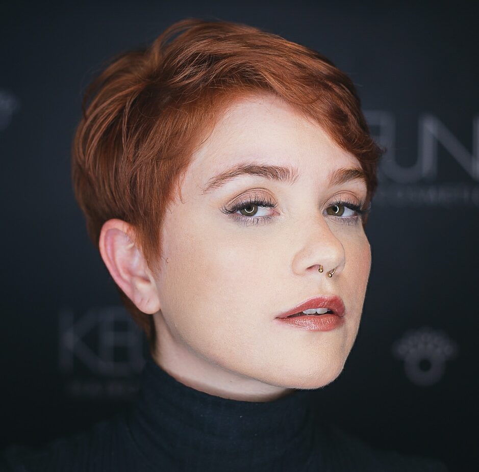 Another cute little Pixie cut where bright and bold copper red hair color has been used to make the hairstyle stand out. For extra lift when styling try adding styling aids to the root area.