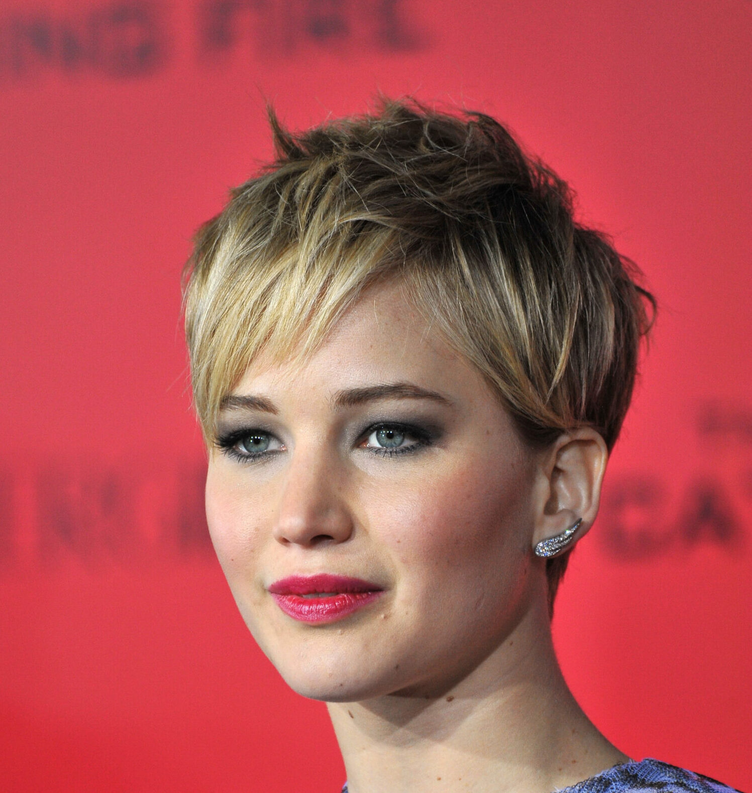 Jennifer Lawrence shows has to wear a Pixie Cut with longer wispy bangs and shorter top area.